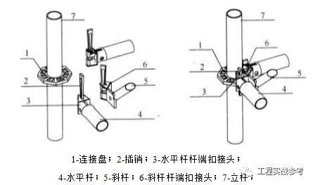盘扣节点应由焊接于立杆上的连接盘、水平杆杆端扣接头和斜杆杆端扣接头组成,如下图: