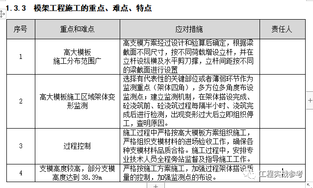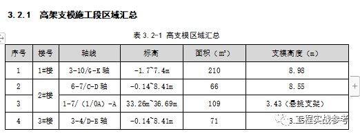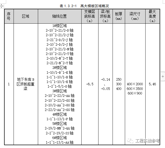 地下车库B区存在超重梁、超重板,最大梁尺寸为600×3500mm,仅有一处,长度为1.5m。最多超重梁尺寸为400×2000mm。最厚板为400mm。1#、2#、3#、4#、5#、6#局部存在高架支模,具体高大模板施工区域概况详见表1.3.2-1。加入2023年度《工程实战参考》会员2022年度《工程实战参考》会员资料第四章  施工工艺技术