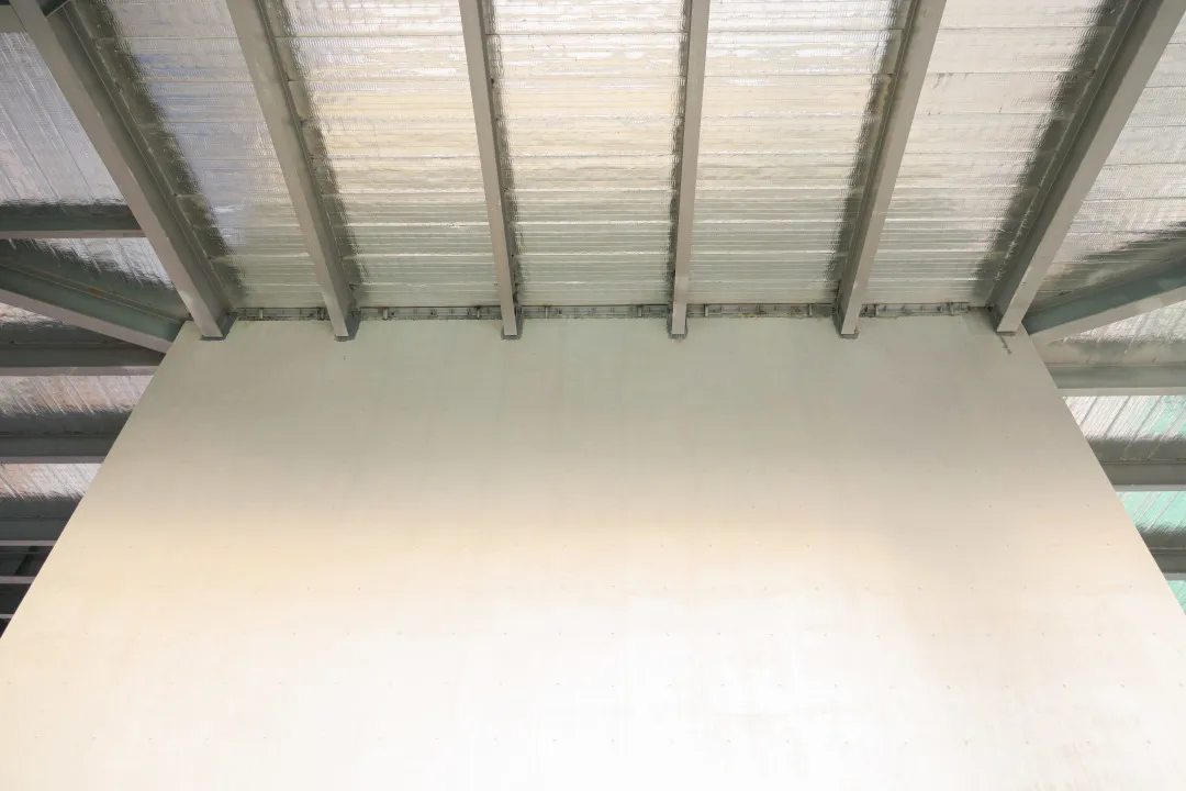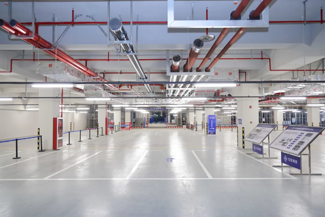 工程地库地坪采用聚氨酯弹性静音超耐磨地坪,主要包含底涂、中涂、面涂、罩面四道施工工艺。该地坪安全稳定,耐污、耐久性能好,可有效去除轮胎摩擦产生的黑色印迹和噪音,防滑、美观,拥有出色的柔韧性和耐磨性。同时利用BIM技术对机电各专业管线进行综合排布,最大限度利用综合支架,合理利用有效空间,达到科学、安全、美观效果。
