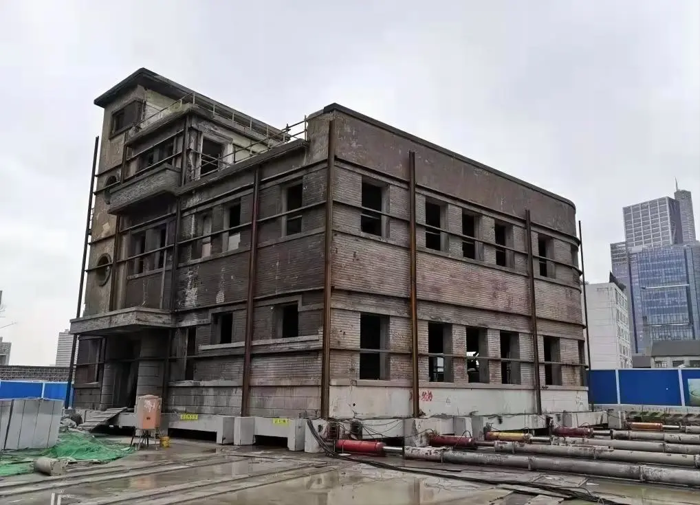 基坑内历史建筑平移保护技术 工程红线范围内包含一栋优秀历史保留建筑,通过对建筑场区内平移及逆作顶板施工,使建筑直接移动到永久位置,不额外占用场地。