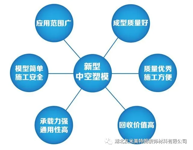 新型中空塑料模板:整个系统标准化程度高,重量轻、配合精度高,周转次数多、承载能力高,应用范围广、施工方便、减少施工人员、减轻劳动强度、提高施工质量。回收价值高,可再生利用,完全可以做到建筑垃圾零排放。