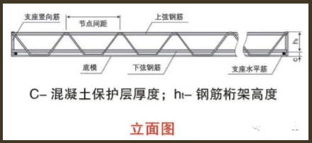 ★上下弦钢筋、支座钢筋(竖筋、水平筋)统一采用三级热轧HRB400钢筋,腹杆可采用热轧HRB235钢筋或冷轧光圆550级钢筋。钢筋各项力学性能指标应符合《混凝土结构设计规范》和《冷轧带肋钢筋》的相关规定。