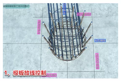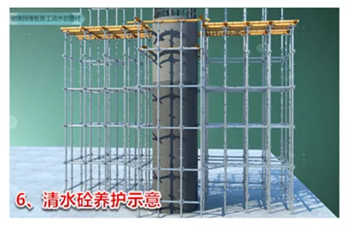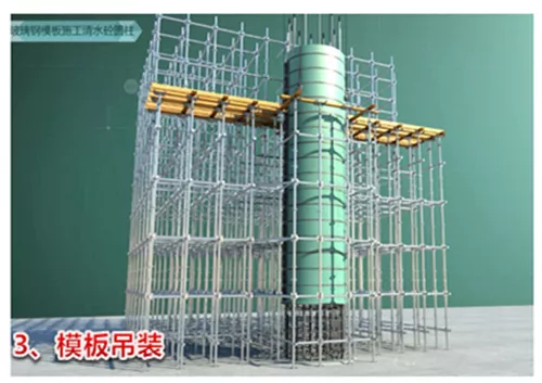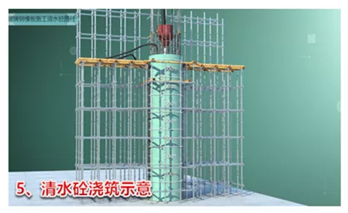 根据柱子尺寸,工厂定制加工两块半圆形玻璃钢模板,将T形密封条粘贴在模板侧壁的槽口内,现场将两个半圆模板合模,并插好定位销,检查模板内侧拼缝平整度,符合要求后,安装钢抱箍并用螺栓收紧,最后整圆玻璃钢模板通过整体吊装就位,一次浇筑成型。在施工过程中,通过运用三维数字化技术对整体工艺进行施工流程模拟和可视化三级交底,为实现高标准清水饰面提供了保障。