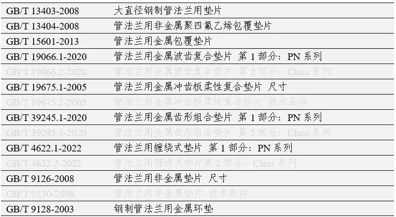(3)金属包覆垫属半金属/金属垫片。(4)金属环垫属金属垫片,主要用于环连接面密封的法兰。1.2 国标垫片的标准体系2019年,我国国标将13项GB/T 9112~9124-2010系列法兰标准,按照公称压力整合为欧洲体系(PN系列)和美洲体系(Class系列)等2项标准。之后,垫片的标准也在由传统的尺寸技术条件两本修编过渡为PN系列Class系列,目前现行的国标管法兰标准如下