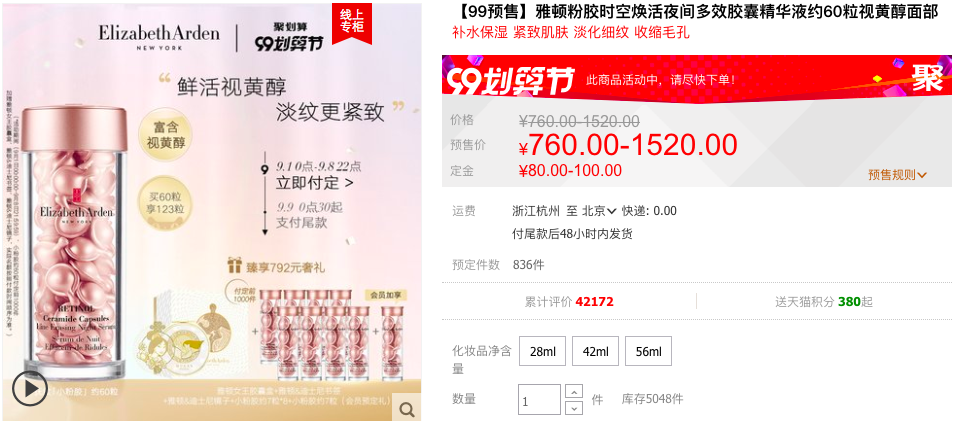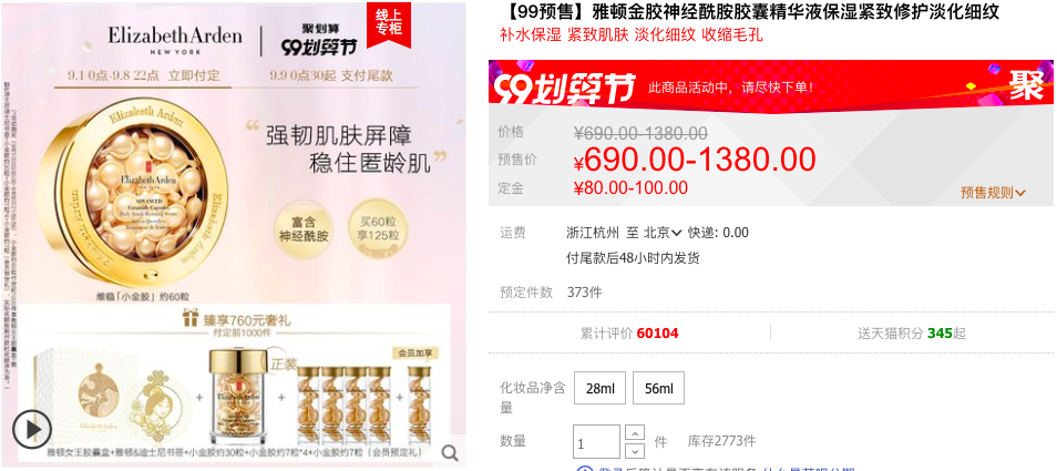 雅顿金胶是一款综合型的精华油,保湿、抗老多效合一,不含香精、酒精、防腐剂,对于干皮比较友好,偏油皮慎用。在其天猫旗舰店日常价 690 元 / 60 粒,需付定金 80 元,可领 50 元券,入会前 1000 件买即送同款 65 粒,到手价 640 元 / 125 粒,合单粒 5.12 元,近期好价。