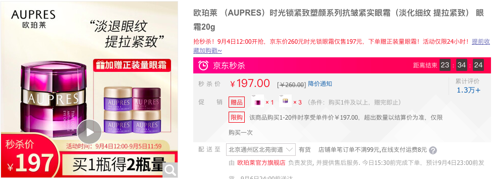 👆活动价:197 元 / 40g👆 欧珀莱这款眼霜又被称为“眼部小熨斗”,蕴含 8 种植物成分促进眼周胶原蛋白生成,对于眼周干燥、细纹、暗淡和松弛等问题都有改善。而且质地柔润易吸收,很适合抗初老和轻熟龄肌使用。在其京东旗舰店日常价 260 元 / 20g,秒杀价 197 元,买送小紫钻眼霜 5g*3 + 同款眼霜 5g,相当于买 1 送 1,活动截至明天中午,好价可入。