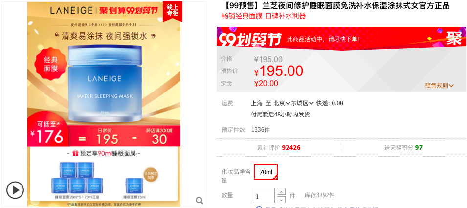 在其天猫旗舰店日常价 195 元 / 70ml,需付定金 20 元,可领 5 元券,买即送同款小样共 75ml,入会加送 15ml,到手价 190 元 / 160ml,比买 1 送 1 还多,可叠加跨店满减更划算。