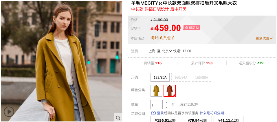 👆活动价:268 元👆 ME&CITY 这款双面呢大衣是较为修身的版型,肩线线条挺拔,会显得人十分干练有气场。过膝的中长款,既能遮肉、又能挡风保暖。78% 的绵羊毛含量,用量很扎实了。目前有深鹅黄和砖红色可选,前者码全,后者部分断码。在其天猫旗舰店日常价 2199 元,9 日前 1 小时到手价 246 元,1.1 折好价。