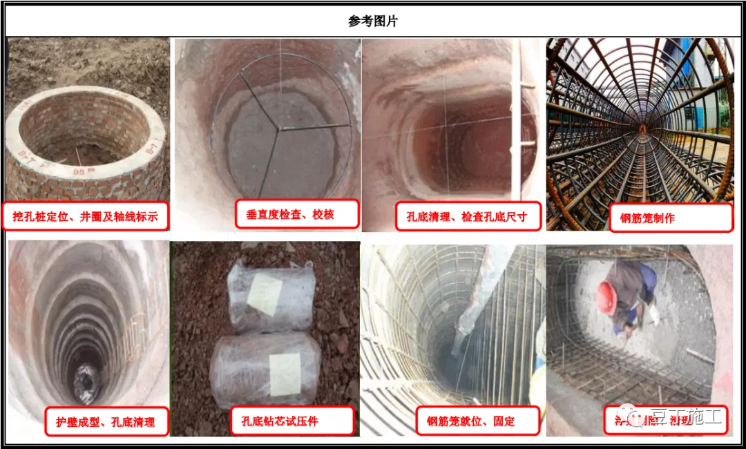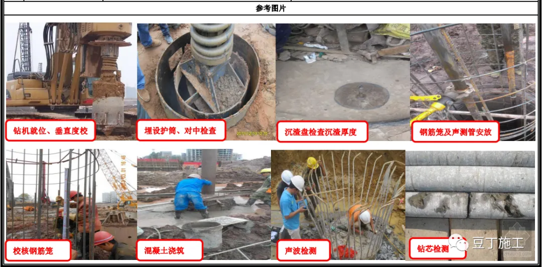 5、 终孔检查要点控制见本表中工 艺流程 11。过程中必须全数检 查后,做好挖孔桩施工三方检 查签字记录。