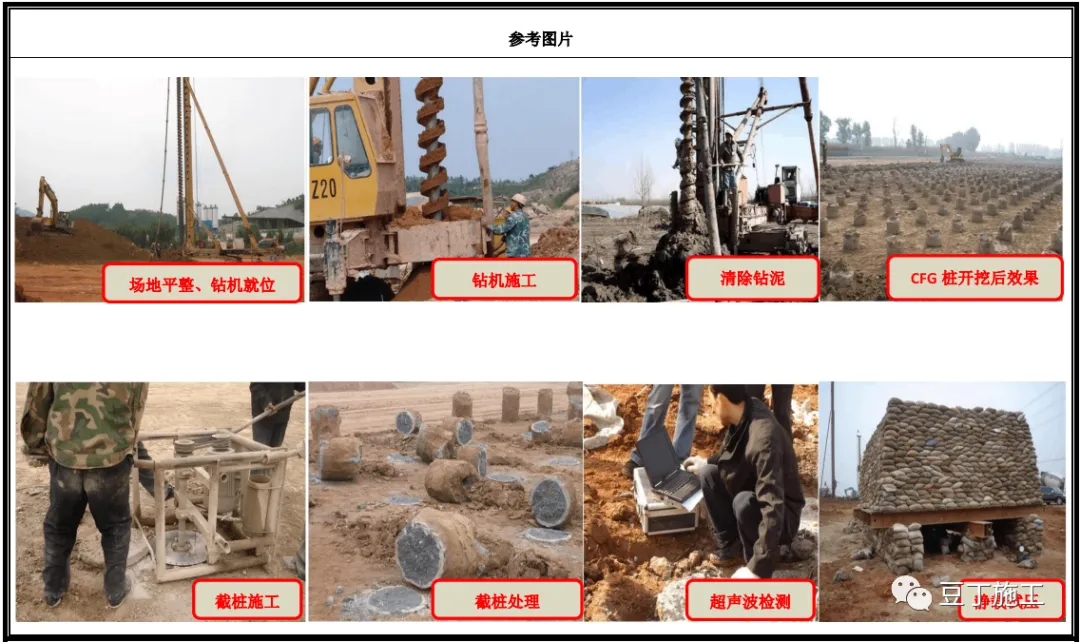 桩身完整性检测,CFG 桩桩身完整性采用低应变动力试验检测,桩的检测率 10%, 根据检测结果判定桩身完整性;CFG 桩混合料强度检测:每台班制作混合料标准立方 体试件 3 组,按照规范标准养护(56d)后,进行试件抗压强度检测。根据检测结果 判定其质量情况;CFG 桩地基静力载荷试验:分别进行单桩复合地基静力载荷试验, 计算沉降与承载力。检验数量:桩数的 0.2%。
