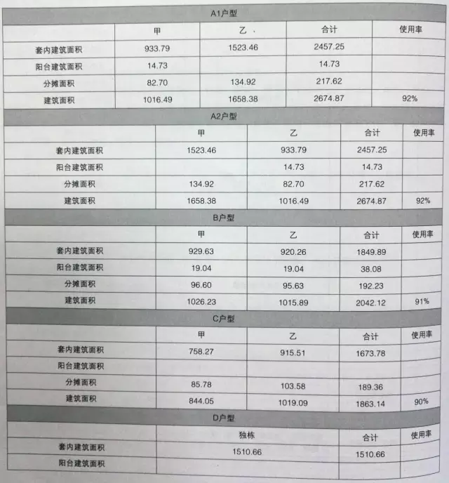 共有6种户型,物业类型有独栋和双拼,独栋面积范围从1555.79——3384.96平方米。可分割面积范围在844-1845平方米,下面是附表。