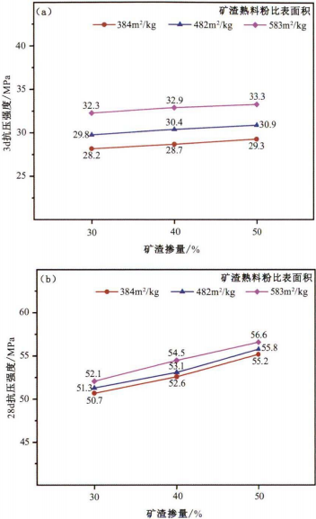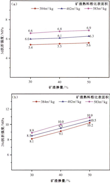 (3)优化粉磨矿渣水泥的抗折和抗压强度较高;矿渣掺量增加和矿渣熟料粉比表面积增大,其抗折和抗压强度提高;其3d强度主要与矿渣熟料粉比表面积有关,28d强度主要与矿渣掺量有关。