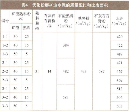将熟料破碎、矿渣烘干,按矿渣:熟料=30:25、40:15或50:5的质量比例和表4的比表面积混合粉磨,得到矿渣熟料粉;将熟料破碎,按表4的比表面积单独粉磨,得到熟料粉;将石灰石和石膏破碎,按表4的比表面积混合粉磨,得到石灰石石膏粉。将以上半成品物料按表4的质量配比均匀混合,制得优化粉磨矿渣水泥。