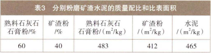 从表2~4可知,混合粉磨矿渣水泥、分别粉磨矿渣水泥以及编号2-2优化粉磨矿渣水泥的矿渣掺量均为40%,水泥比表面积约为465m²/kg。