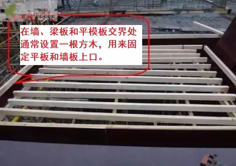 2.5 楼板与墙板或梁板交接阴角处均应设置一根通常方木,用来固定阴角处模板,保证阴角顺直和防止漏浆。