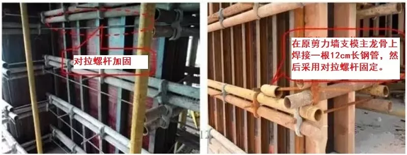 4.3 墙厚为250mm及以上时剪力墙阳角加固:在原剪力墙支模主龙骨上焊接一根12cm长钢管,然后采用对拉螺杆固定。