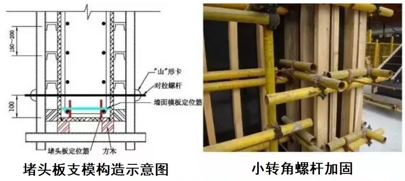 4.1 剪力墙堵头板模板拼缝处应采用方木固定,防止剪力墙阳角漏浆.对于较短剪力墙堵头板建议采用通长螺杆加固,防止剪力墙端头变形、胀模。