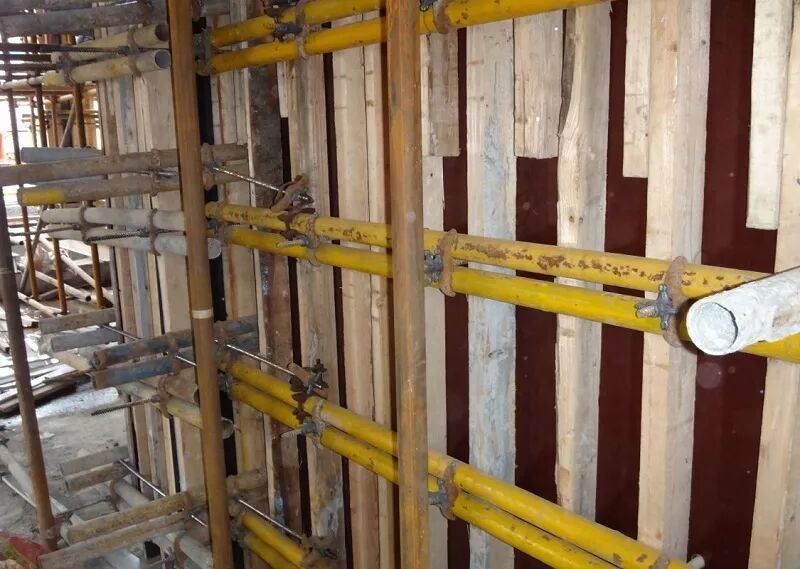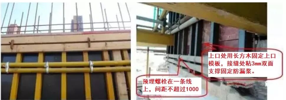 6.1 在外剪力墙支模时,所有加固方木应与模板上口平齐,再在上口处结合预埋螺栓设置通长方木,用来固定上口模板,防止变形,保证墙体混凝土外边平直度。