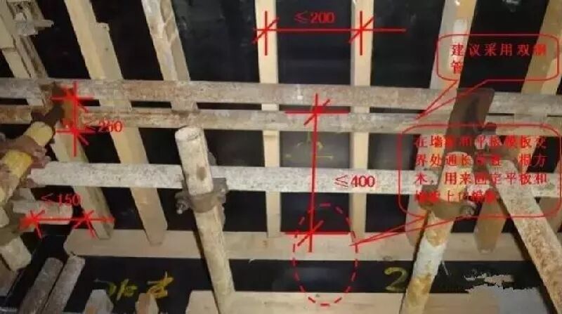 2.2 木龙骨或型钢布置距墙面、梁面的距离控制在150mm以内,方木悬挑长度控制在250mm以内为宜。