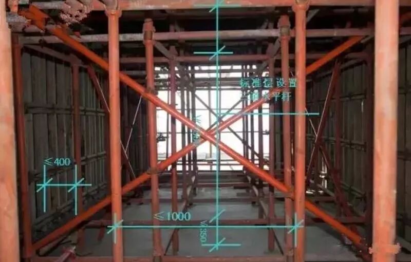 1.2 架子立杆高度应选择比楼层净空高度低400mm左右的钢管;标准层应设置三道纵横向水平管,扫地杆离地不得超过200(碗扣件离地不得超过350),钢管上端自由端不得超过500,可调U型顶托螺纹部分不得超过250。