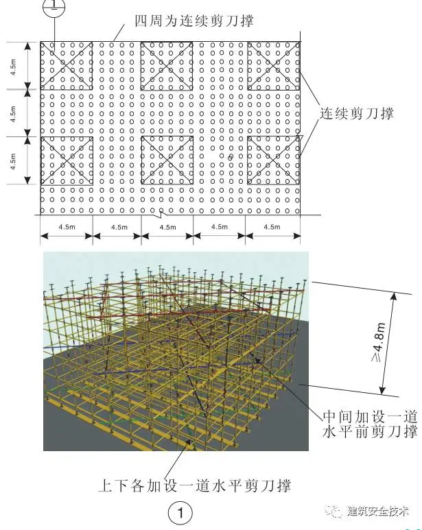 1. 当立柱间距小于或等于1.5m时,模板支撑架四周从底到顶连续设置竖向剪刀撑;中间纵、横向由底至顶连续设置竖向剪刀撑,其间距应小于或等于4.5m。