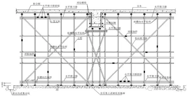 1. 满堂模板和共享空间模板支架立柱,在立柱底距地面200mm高处,沿纵横向水平方向应按纵下横上的顺序设扫地杆,在每一步距处纵横向各设一道水平拉杆。在外侧周圈应设由下至上的竖向的连续式剪刀撑,中间在纵横向每隔10m左右设由下至上的竖向连续式剪刀撑,宽度宜为4.5-6m,并在剪刀撑的顶部、扫地杆处设置水平剪刀撑。剪刀撑杆件的底端应与地面顶紧,夹角宜为45°~60°