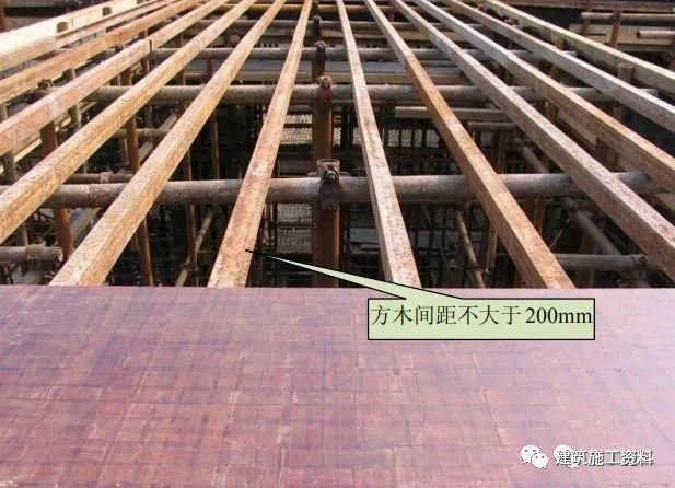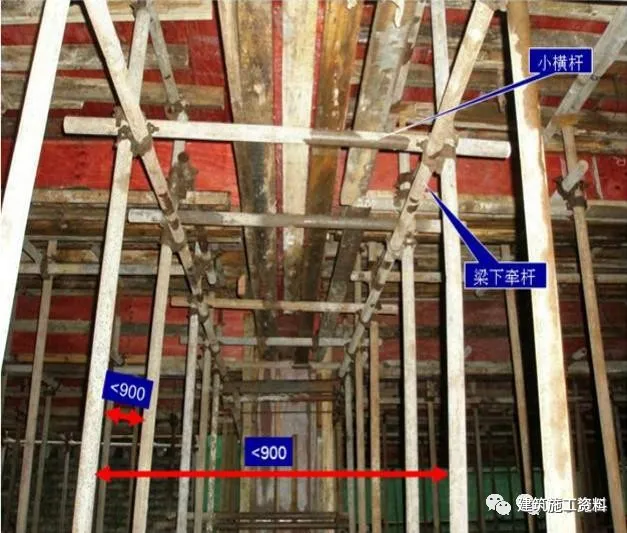 钢管脚手架模板支撑体系,一般标准层(100 厚)板下立杆间距不得大于1.2m,梁下支撑立杆间距不得大于0.9m,扫地杆距楼面≤200mm,第一道水平杆步距≤1.5m。板厚大于 120或层高大于 3m 或梁高大于 700 时,支撑体系应按专项方案执行。