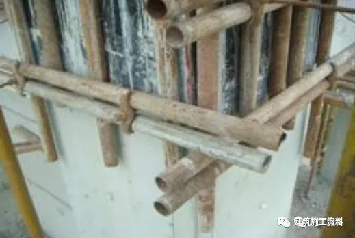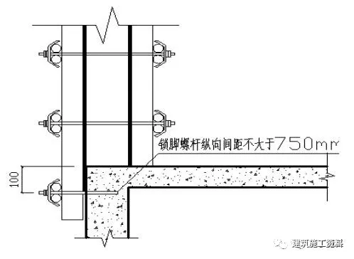 2、上下层柱(墙)层间交界处增设锁脚螺杆,锁脚螺杆距墙柱水平施工缝100mm,间距不大 于 750mm,每侧锁脚螺杆不得少于2根。