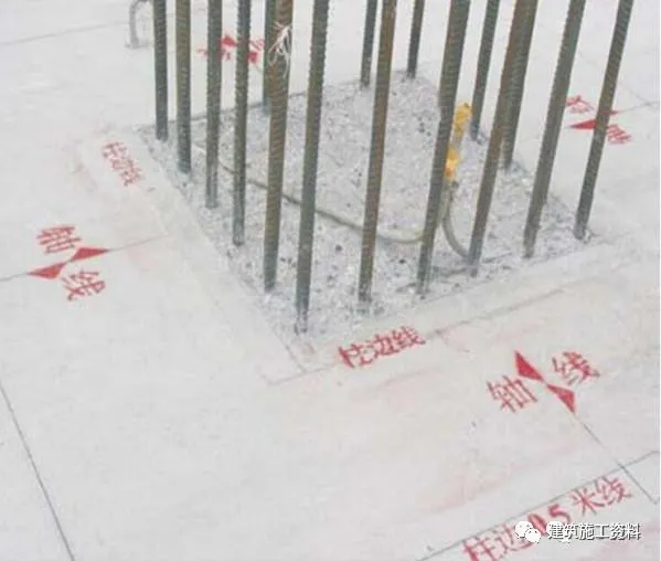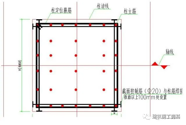 2、按构件截面边线焊接截面控制筋(或植筋),柱每个方向两根,剪力墙内截面控制筋设置间距≤600mm,从板顶向上 5-8cm 设置。
