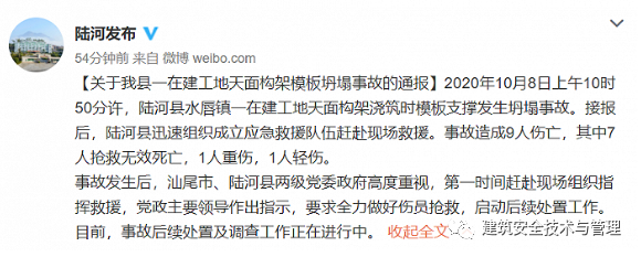 广东省汕尾市陆河县人民政府官方微博消息,2020年10月8日上午10时50分许,陆河县水唇镇一在建工地天面构架浇筑时模板支撑发生坍塌事故。接报后,陆河县迅速组织成立应急救援队伍赶赴现场救援。事故造成9人伤亡,其中7人抢救无效死亡,1人重伤,1人轻伤。事故发生后,汕尾市、陆河县两级党委政府高度重视,第一时间赶赴现场组织指挥救援,党政主要领导作出指示,要求全力做好伤员抢救,启动后续处作。目前,事故后续处置及调查工作正在进行中。模板工程安全一直容易被忽视,但出事就是大事!下附模板工程安全手册,请学习重视!模板工程