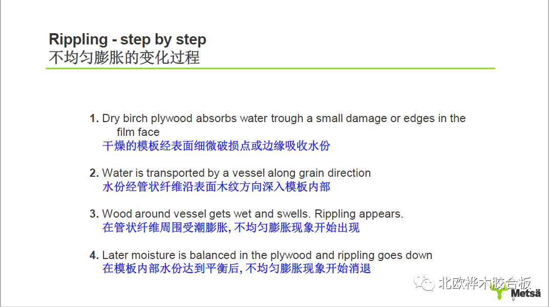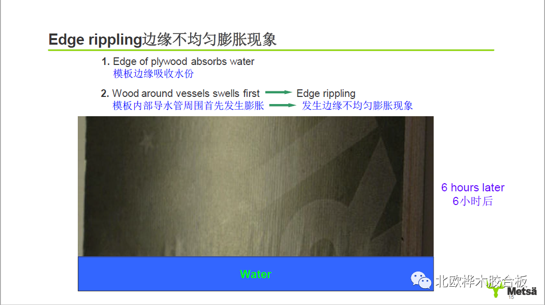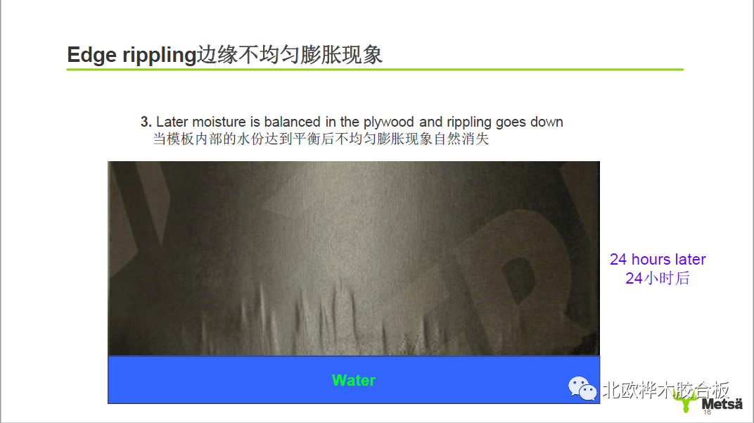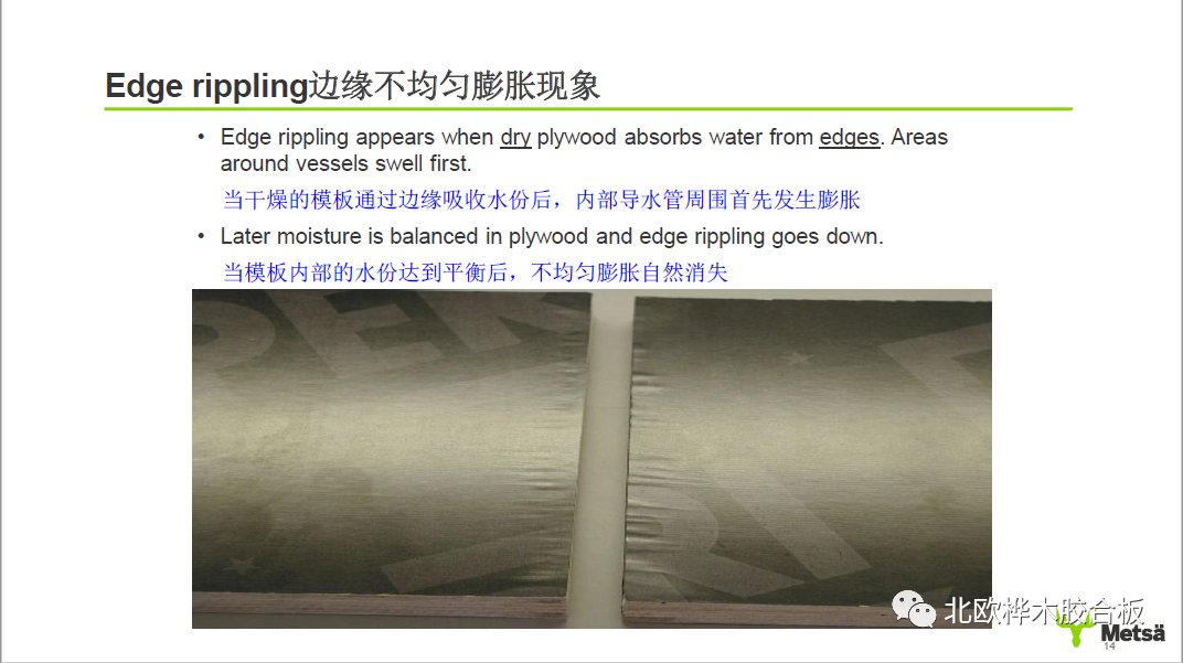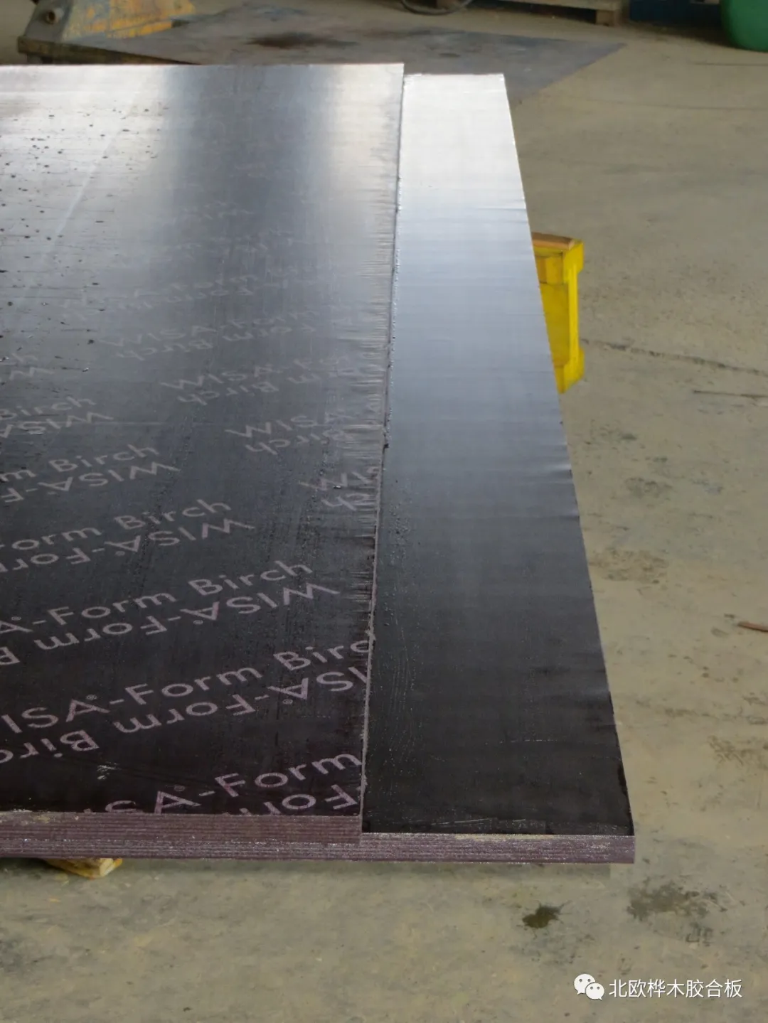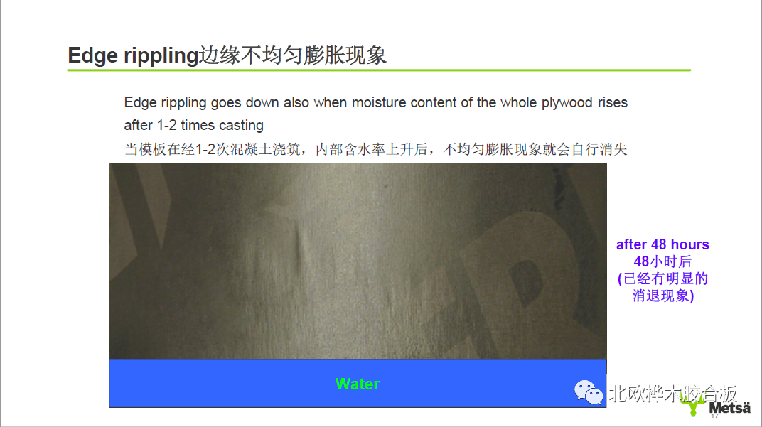 但由于模板出厂时非常干燥,其内部含水率只有8%,因此在模板前几次浇筑时都会有一个水份进入模板内部的水份平衡快慢问题。在安装孔和新切割没封边的侧边,普遍会有吸水不均匀而产生的不均匀膨胀现象。在经过3-5次的实际浇筑后,模板内部的水份会从8%慢慢升高到27%,在最后水份平衡后,这些起皱膨胀现象都会慢慢消退的。在这个过程中,模板表面的一些细微的膨胀痕迹,不会对混凝土浇筑带来影响,色泽上也基本保持一致的。