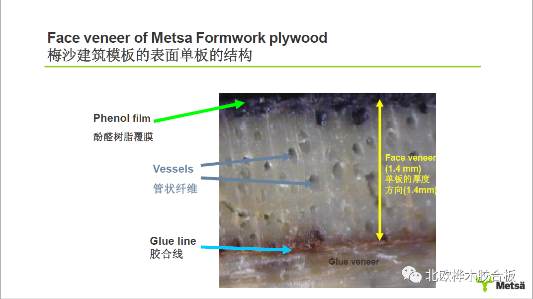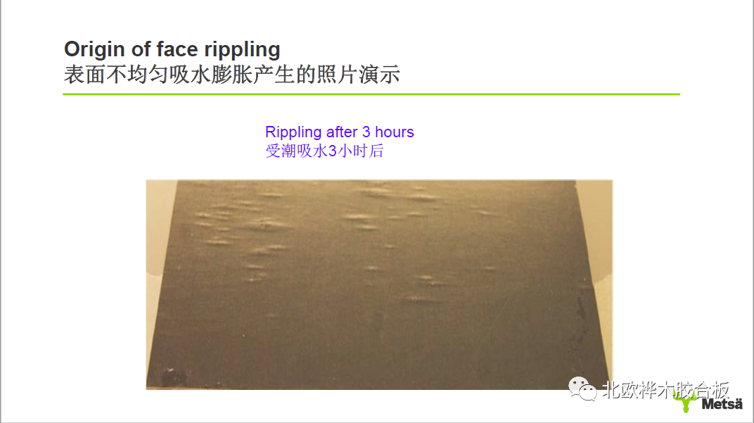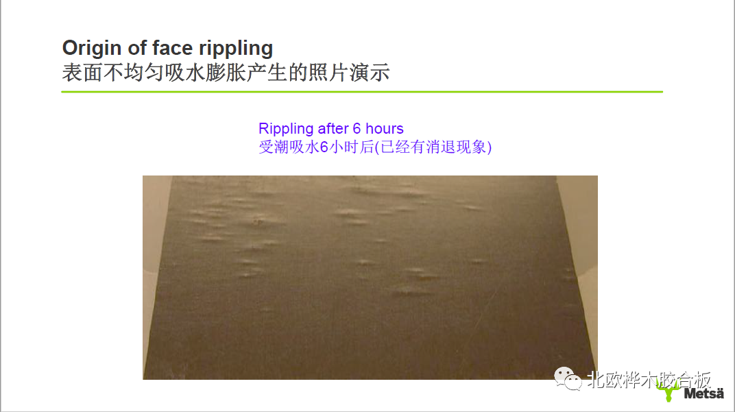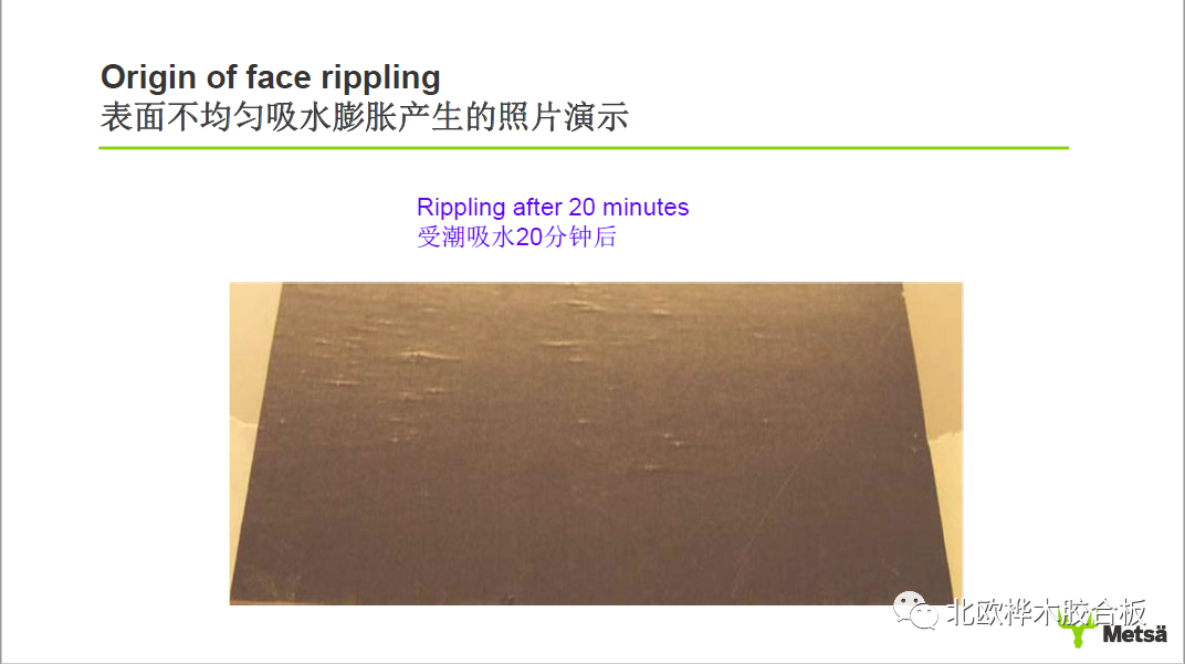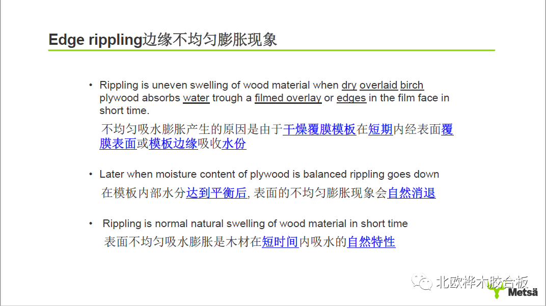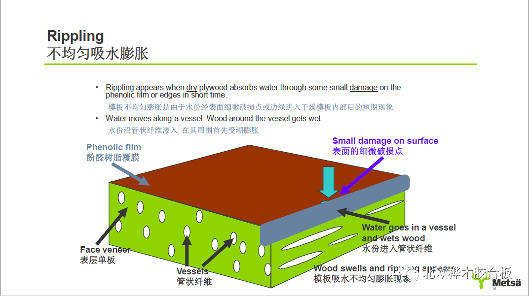 但由于模板出厂时非常干燥,其内部含水率只有8%,因此在模板前几次浇筑时都会有一个水份进入模板内部的水份平衡快慢问题。在安装孔和新切割没封边的侧边,普遍会有吸水不均匀而产生的不均匀膨胀现象。在经过3-5次的实际浇筑后,模板内部的水份会从8%慢慢升高到27%,在最后水份平衡后,这些起皱膨胀现象都会慢慢消退的。在这个过程中,模板表面的一些细微的膨胀痕迹,不会对混凝土浇筑带来影响,色泽上也基本保持一致的。