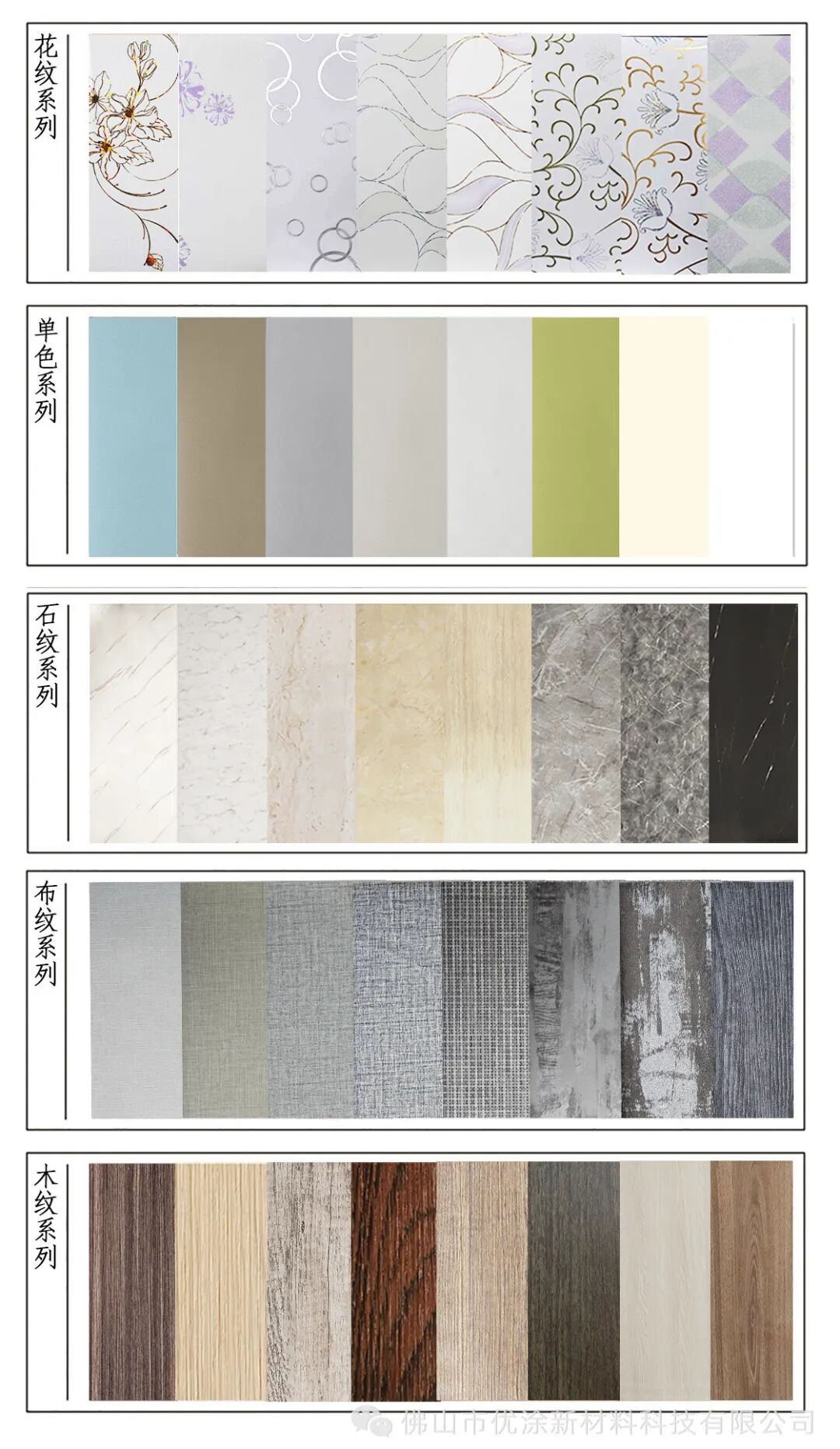 金属覆膜板花色多样,常用花色有布纹系列、木纹系列,大理石纹系列、纯色系列等,花色自然逼真,质感细腻,可应用在不同风格的房屋。