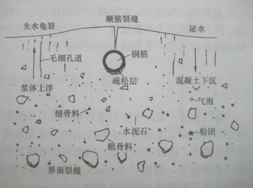 塑性坍落裂缝 一般多在混凝土浇注过程或浇注成型后,在混凝土初凝前发生,由于混凝土拌合物中的骨料在自重作用下缓慢下沉,水向上浮,即所谓的泌水,若是素混凝土,混凝土内部下沉是均匀的,若是钢筋混凝土,则混凝土沿钢筋下方继续下沉,钢筋上面的混凝土被钢筋支顶,使混凝土沿钢筋表面产生顺筋裂缝。这种塑性塌落裂缝,对于大流动性混凝土或水灰比较大的混凝土尤为严重。裂缝一般特征:混凝土沿钢筋表面产生顺筋裂缝。