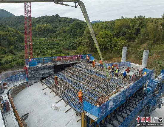 ▲苍梧至容县高速公路苍容浔江大桥首个锚碇顺利浇筑现场。图源:广西交投集团