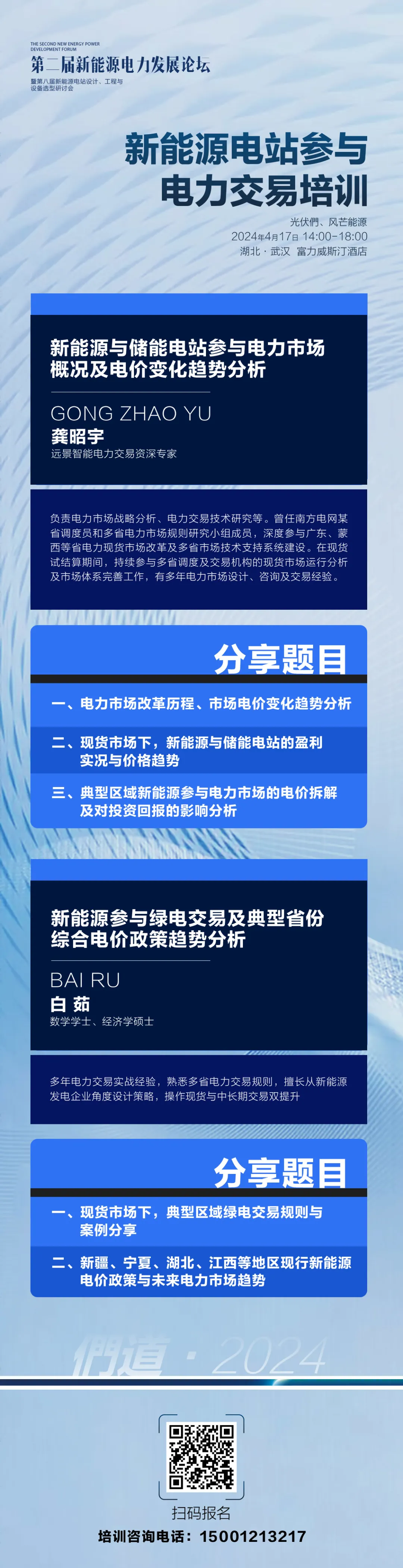 2024年4月17-19日,2024新能源电力发展论坛暨第八届新能源电站设计、工程与设备选型研讨会同期将举办“新能源电站参与电力交易培训”,覆盖华北、华南、西北、西南等多个区域新能源与储能电站参与电力市场的概况、电价变化趋势、绿电交易以及各省电价情况拆解等,以帮助投资企业更好的预判各地新能源电站的投资价值,同时做好存量电站的报价策略管理。