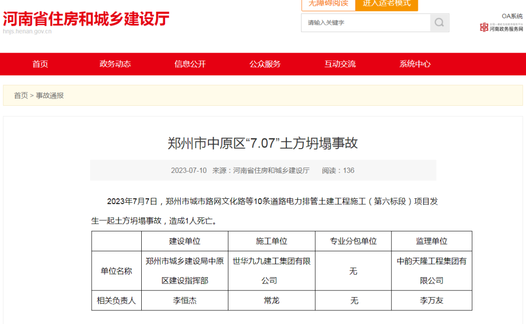 2023年7月7日,河南郑州城市路网文化路等10条道路电力排管土建工程施工(第六标段)项目发生一起土方坍塌事故,造成1人死亡。