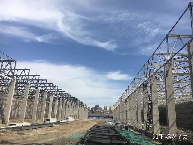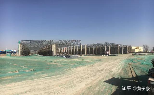 吊装上钢屋架以后的样子。中间这跨也有钢屋架,但是如果全部钢屋架都吊完了,中间的屋面板就没法往上吊了,所以中间这跨的钢屋架留着和屋面板一起往后退着吊。吊装钢屋架就是钢结构的事了,和预制柱无关,这两张照片仅为了展示预制柱的作用。