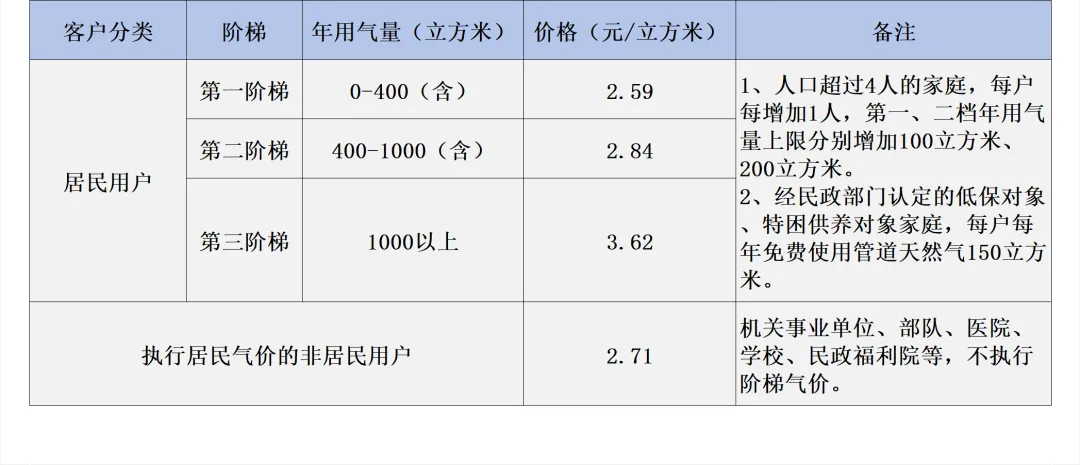 上游居民气源价格在2023年12月19日前上涨的部分,由城市燃气经营企业自行承担,不得向居民用户以及学校等执行居民气价的非居民用户追溯传导。 03阶梯气量如何执行?