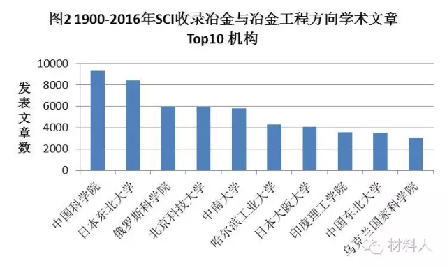 接着看一下这466413篇文章按国家和机构排名的情况。图1是按照国家进行排名的情况,中国、美国和日本分列前三,再次印证了中国科技大国的地位。而通过图2的机构排名可以看出,中国科学院独占鳌头,而来自中国的科研机构占据了前十名中的五个席位,前身为北京钢铁学院、素有“钢铁摇篮”之称的北京科技大学成为排名最靠前的中国高等院校,而国内钢铁冶金方面的相关名校如中南、哈工大、东北大学等也都进入全球前十。