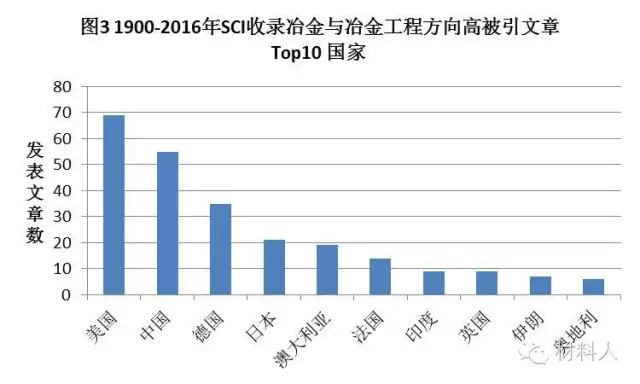 最后,我们来重点关注一下中国科研机构在冶金及冶金工程学术领域的表现如何。表3列出了中国机构发表在SCI期刊上的冶金领域学术文章的排名情况,同时列出了对应的高被引文章数量,括号中为排名。从论文总数量来看,中科院、北科大和中南名列前三,而前十名中的高校除了北科大以外都是985高校;高被引文章数量的情况则有些不同,北科大排名靠后,哈工大和西工大甚至没有高被引文章,不过这并不能说明这些高校在冶金领域的科研实力就不行,只能说是稍逊一筹。总体来看,中国科研机构在冶金领域的表现可圈可点,但仍有很大的进步空间。