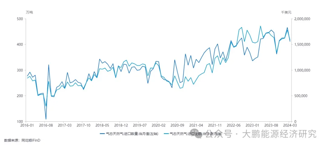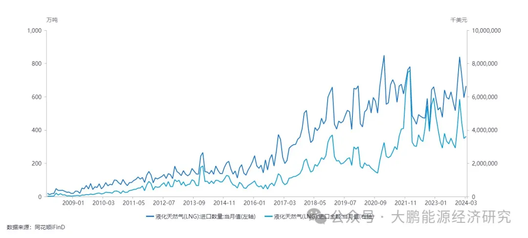 2023年消费量约3900亿立方米,产量约2350亿立方米,管道气进口量约12000万吨,液化天然气(LNG)进口量7132万吨,管道气进口金额为451亿美元,LNG进口金额为645亿美元,二者合计约1100亿美元,换算成人民币将近8000亿人民币。