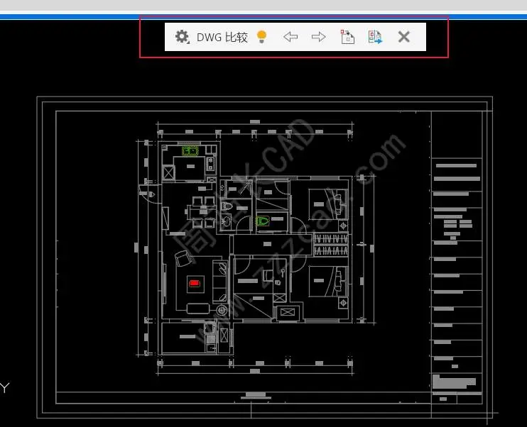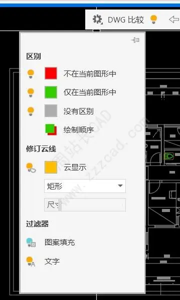 注:红色表示当前图形中没有,对比的图纸中有;绿色表示当前图形中有,对比的图纸中没有。
