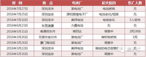 据悉,当时堆放了76.5万个电池(重约15吨),火灾共波及14家企业,造成了巨大的经济损失。随后,警方依法刑拘了6个事故责任人。2016上半年,国内锂电池工厂起火事件不下10例,以下为2016年1-7月国内锂电池爆炸起火详情(注:深圳为事发密集地):