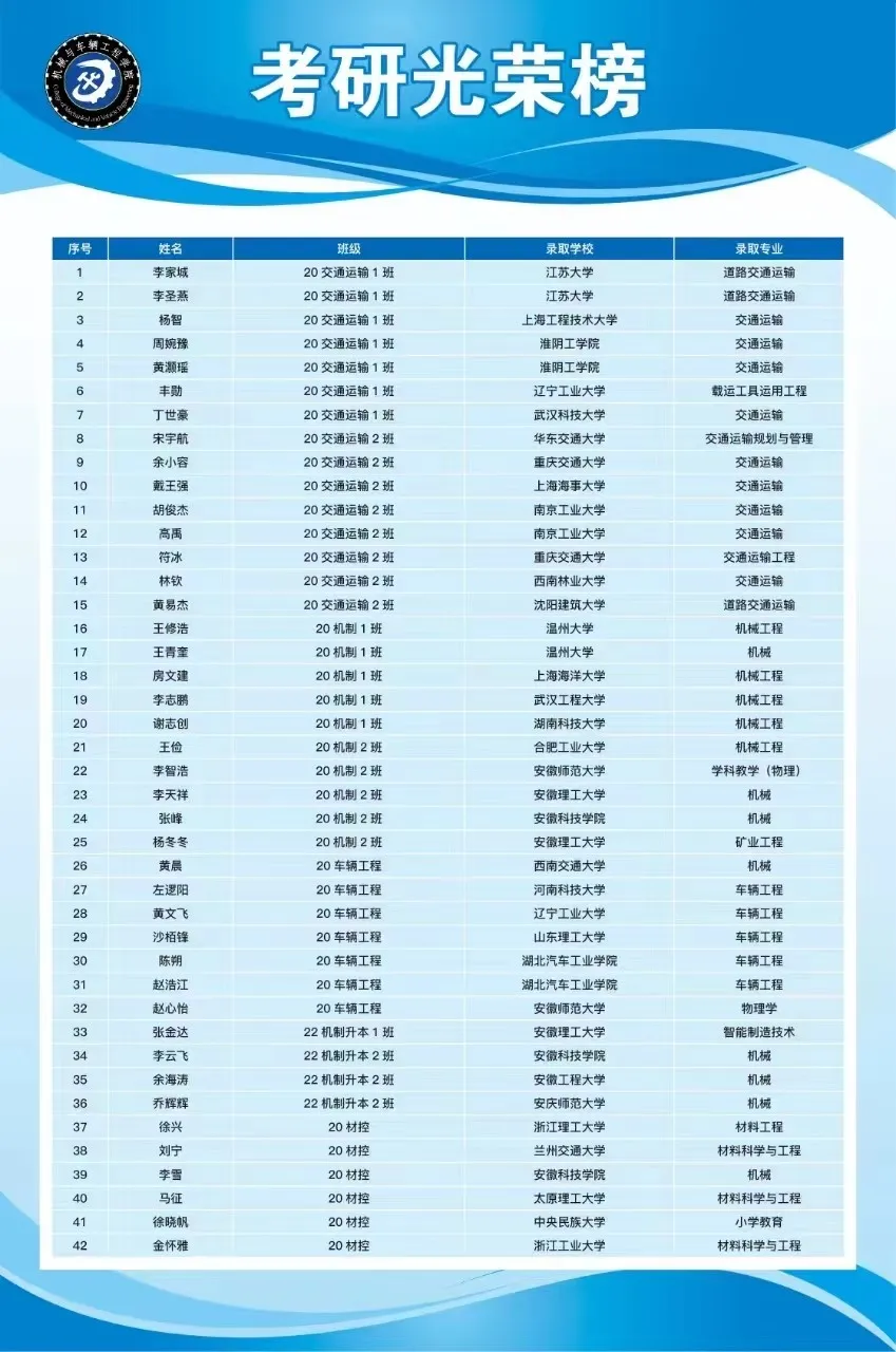 学院现在教职工46人,其中教授5人,副教授10人,硕士生导师5人。近年来,学院获省级教学成果一等奖2项、二等奖1项、三等奖2项;拥有机械设计制造及其自动化省级教学团队。现有省教学名师2人,省级教坛新秀3人;先后承担国家自然科学基金项目1项,承担安徽省自然科学基金项目、科技支撑计划项目等各类科研项目40余项,授权发明专利、软件著作权50余项,发表学术论文100余篇,其中SCI\EI收录40余篇,拥有省级校企合作实践教育基地1个,产学研合作成效显著。学院获批国家级一流本科课程1门,省级质量工程项目14项。