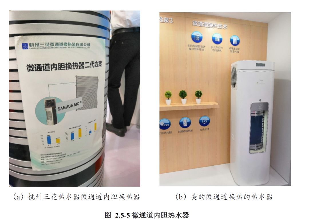 微通道换热技术进一步在供热和热水设备中推广应用。继去年推出的基于冷剂式微通道铝扁管的空气源热泵热水器之后,今年展会上的相关产品性能进一步提升,展出了微通道内胆换热器二代方案,如图2.5-5所示