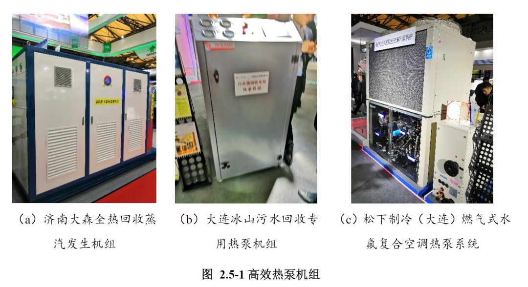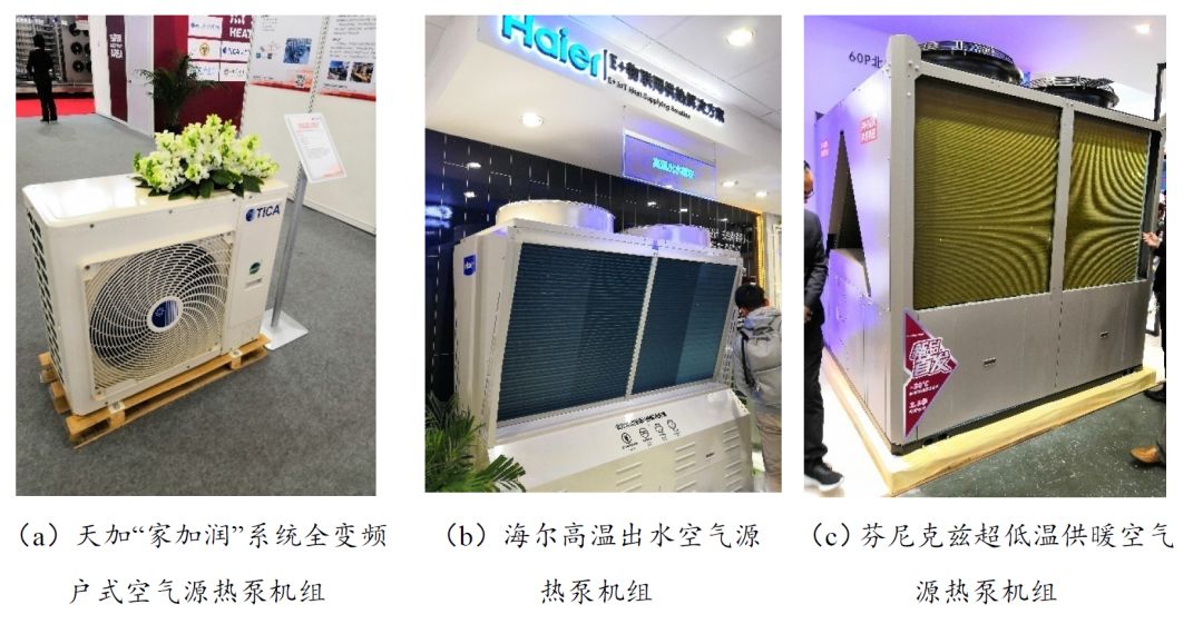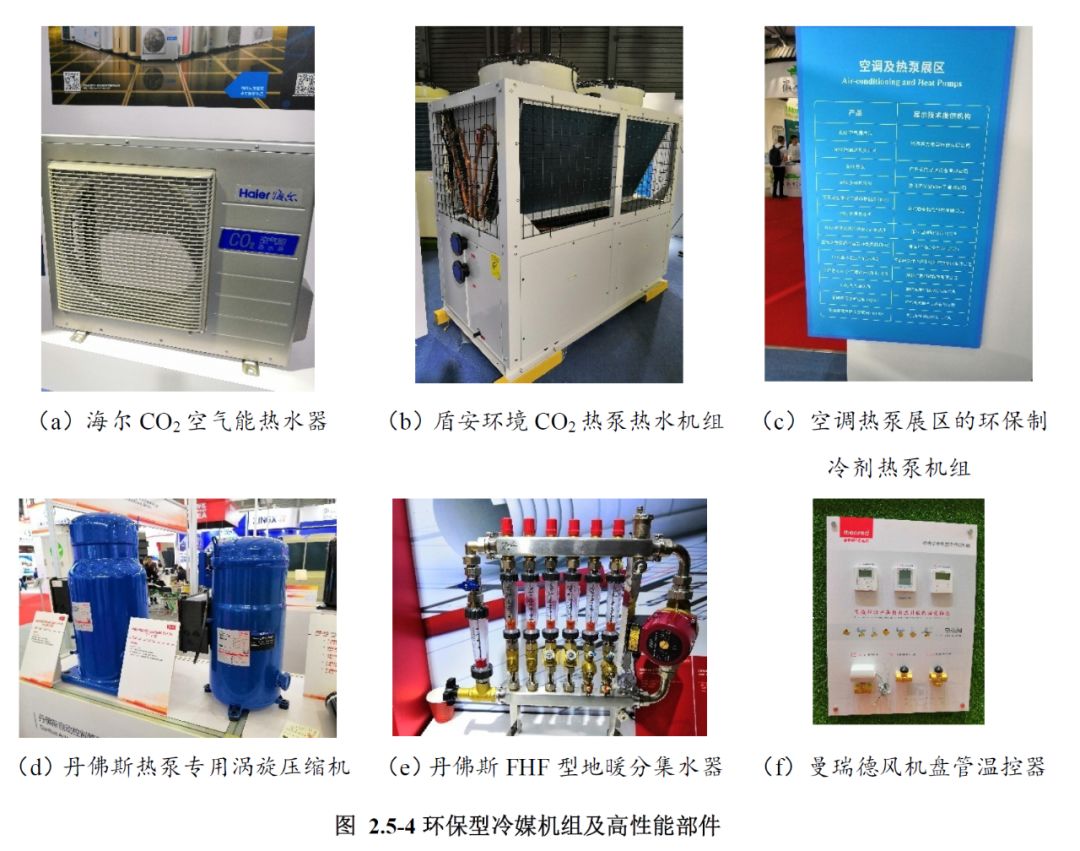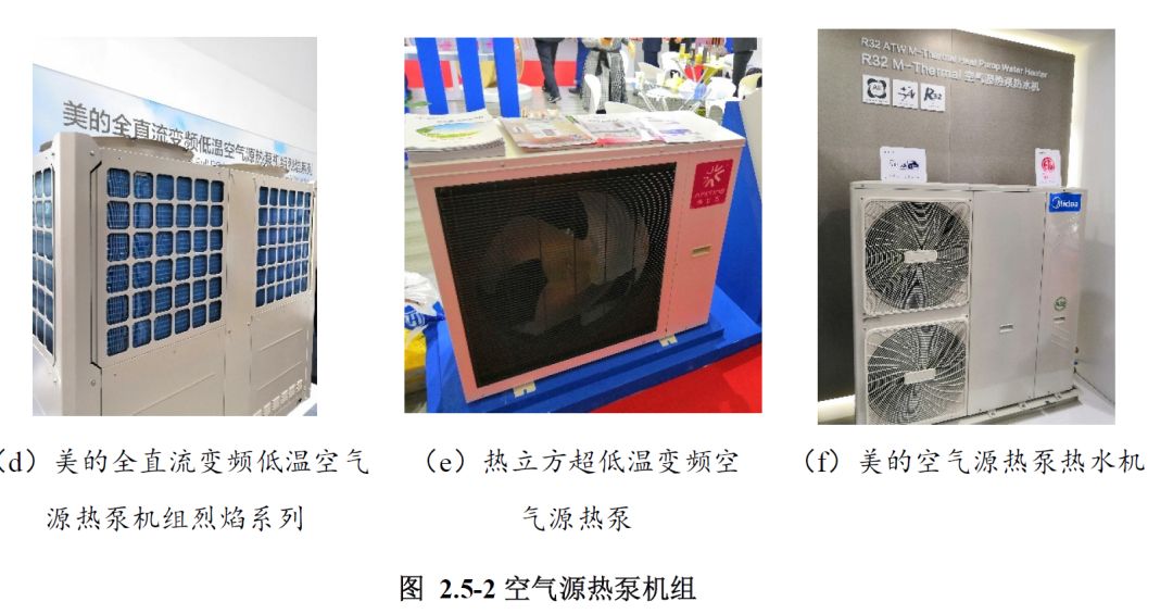 热泵机组的制冷剂更加环保。本次展会展出了格力、美的、海尔、海信、盾安中央空调、浙江国祥以R32为制冷剂的热泵机组;盾安环境、海尔、黑龙江爱科德、昆明东启展出了CO₂为制冷剂的热泵机组;美的、奥克斯展出了以R290为制冷剂的热泵机组,如图2.5-4所示。