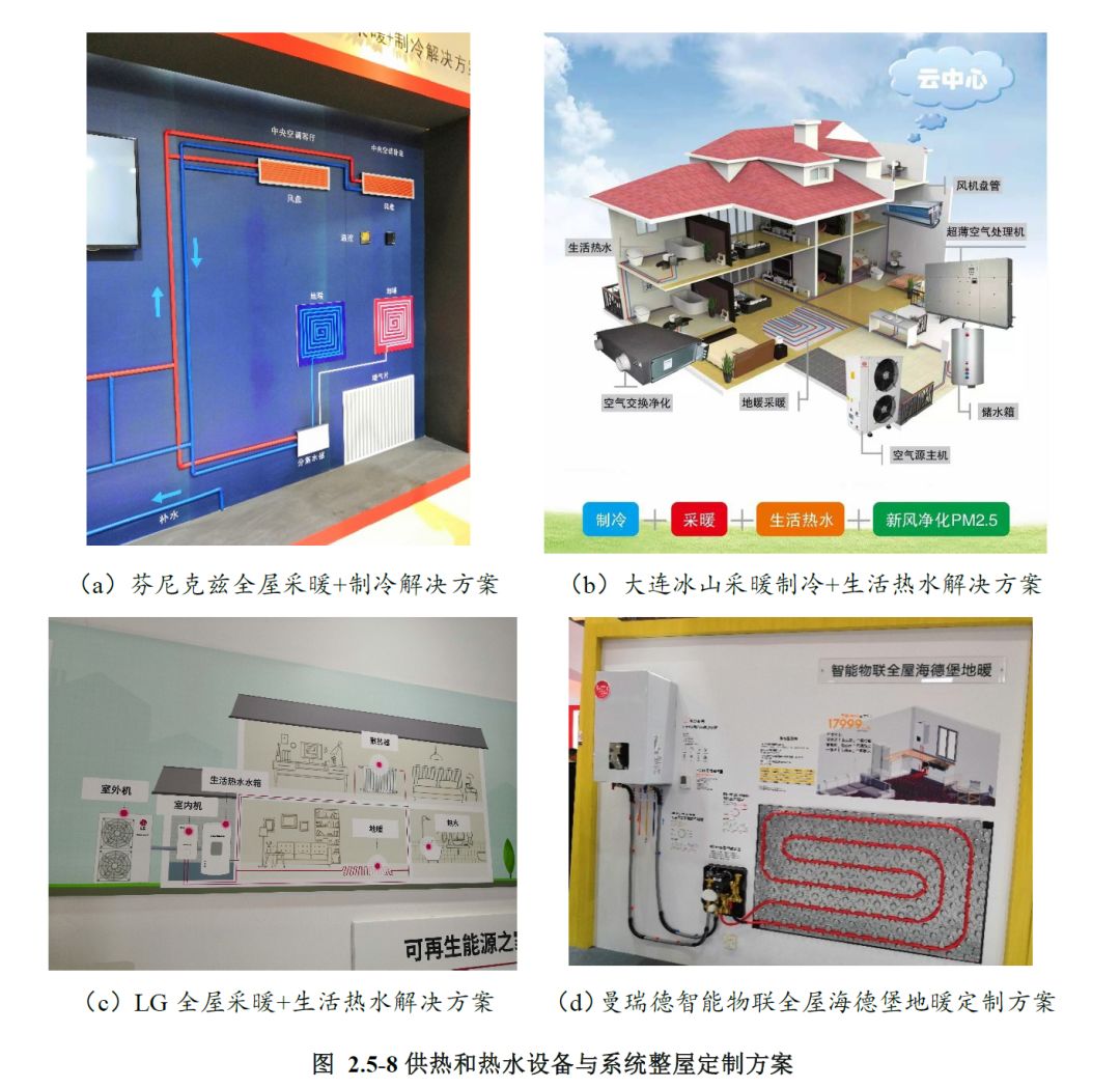 供热和热水设备的最终目标是在较低能耗下创造健康舒适的室内环境。常规供热和热水设备通常是在建筑完成之后再进行安装,从而可能带来供热设备与建筑的匹配性和统一性等问题,同时可能造成冷能和热能的浪费。本次展会上,各设备厂家推出了供热和热水设备与建筑的整体定制方案,如图2.5-8所示。例如,芬尼克兹公司推出了基于热泵空调的全屋采暖+制冷定制方案;大连冰山推出了基于空气源主机的制冷+采暖+生活热水的全屋定制方案;LG推出了基于空气源主机的采暖+生活热水的全屋定制方案;曼瑞德推出了基于燃气壁挂炉的智能物联全屋海德堡地暖定制方案。针对不同建筑特点、功能和布局,全屋定制方案提出相应的供暖、制冷、生活热水的提供方案,实现供热和热水设备与建筑的有机统一。同时,定制方案提出了合理严格的智能化控制方案,实现了室内环境的改善和建筑节能。随着社会的不断发展进步,人们多元化生活的追求,针对不同建筑全屋定制方案的供热和热水设备的设计和控制将是一个重要的发展方向。