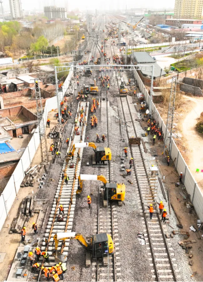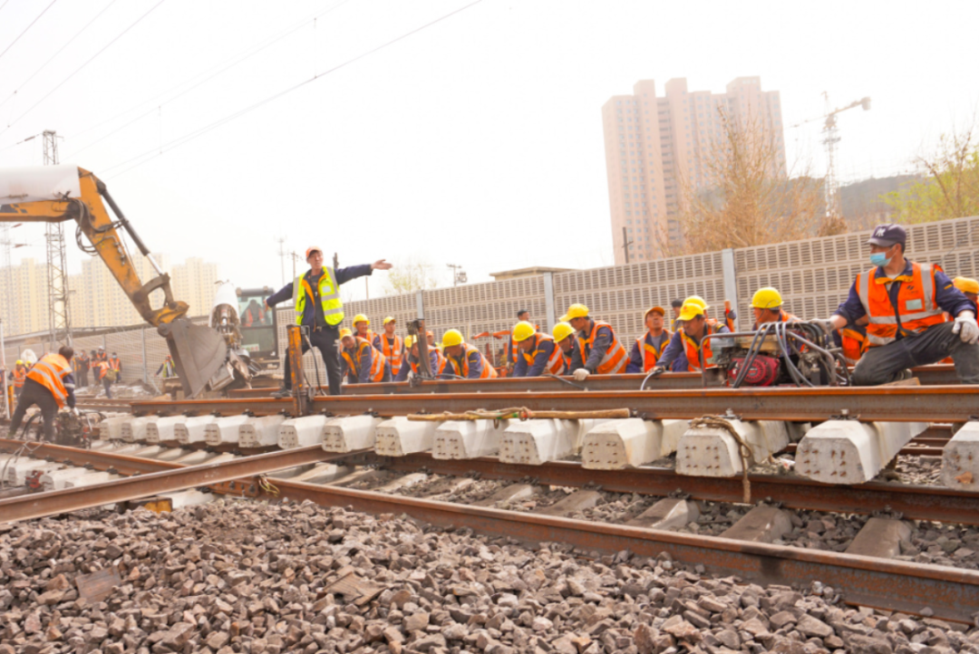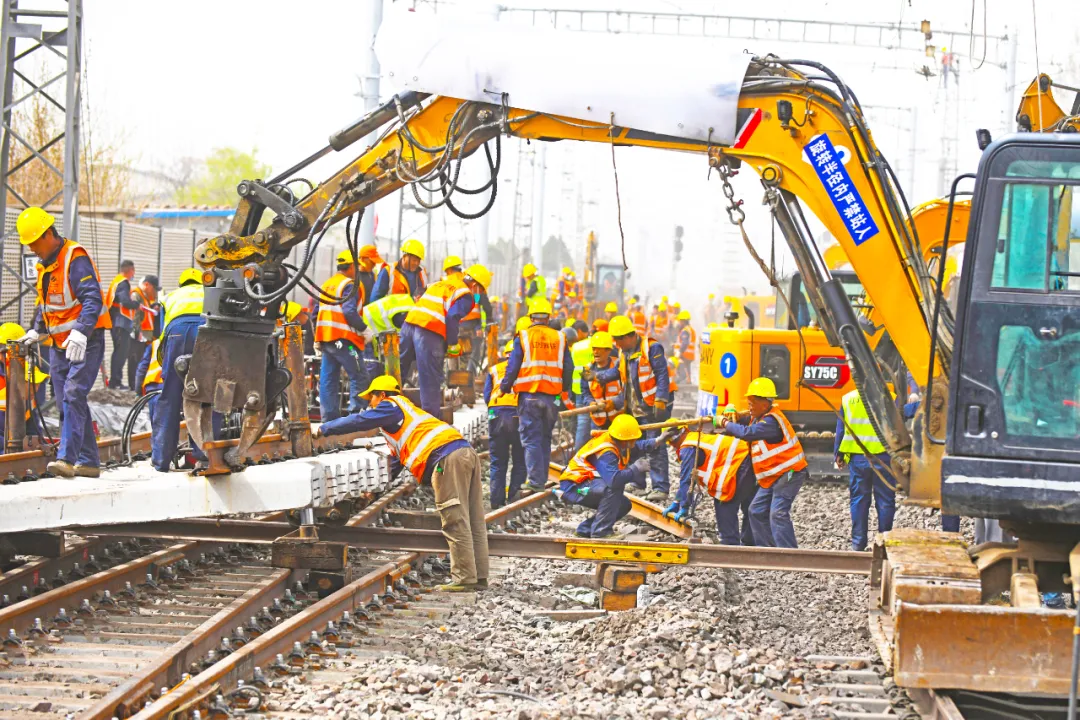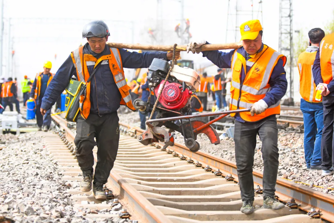 3月28日13时20分,随着天窗命令的下达,辛集站站改施工开始,1100余人涌上线路,现场霎时热闹起来。3月27日至28日的任务是拆除道岔10组、铺设轨排670米、拨接线路340米、小机捣固400米、接触网改造1.32公里、联锁设备改造14处。