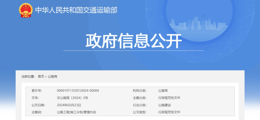 重磅!交通运输部发布《公路工程施工分包管理办法》和《公路工程施工分包负面清单(2024年版)》